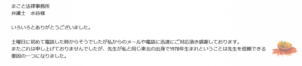 土曜日に初めて電話した時からそうでしたが私からのメールや電話に迅速にご対応頂き感謝しております。